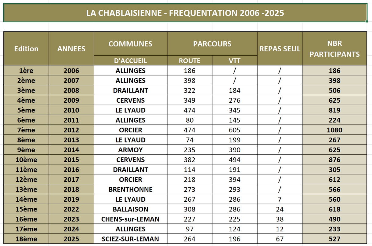 Voici dans le détail de la fréquentation de La Chablaisienne de 2006 à 2025 (annulée en 2020 et 2021 pour cause de crise sanitaire)…
