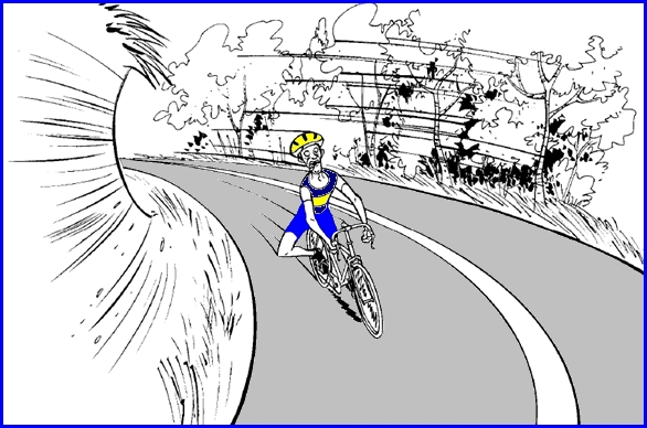 Le cycliste roule trop vite. C’est la force centrifuge qui « tire » la bicyclette vers l’extérieur du virage. Il doit ralentir et la meilleure méthode est de freiner des deux freins en même temps. Cela lui permettra ainsi de mieux contrôler sa trajectoire et de serrer à droite. -