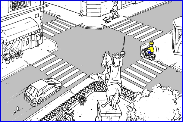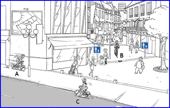 Le cycliste A circule trop vite sur le trottoir. Il risque de heurter la dame avec sa poussette. Il devrait rouler sur la chaussée. La cycliste C est bien positionnée sur la chaussée. B – Les cyclistes peuvent circuler sur les aires piétonnes, sauf dispositions différentes prises par l’autorité investie du pouvoir de police (…) et à la condition de conserver l’allure du pas et de ne pas occasionner de gêne aux piétons (Article R.431-9). -